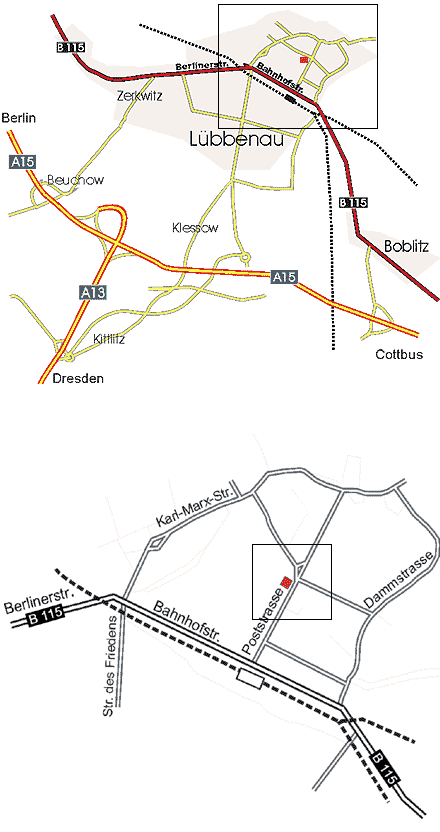 Von Berlin kommend fahren Sie über Beuchow, Zerkwitz auf die B115 und biegen am Bahnhof links in die Poststrasse ab. Von Dresden kommend nehmen Sie die Abfahrt Kittlitz und fahren Richtung Lübbenau Altstadt.Am Bahnhof biegen Sie in die Poststrasse ab. Von Cottbus kommend nehmen Sie die Abfahrt Boblitz. Sie fahren auf der B115 bis zum Bahnhof und biegen dann rechts in die Poststrasse ab. Wolfgang Lehmann & Elisabeth Lehmann Poststrasse 22 03222 Lübbenau Tel.: 03542 / 41237 |
